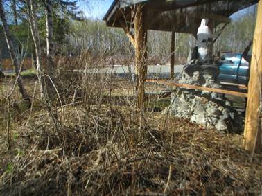 Prístrešok, v ktorom sa nachádza Panna Mária z Beauraingu a Zlaté srdce, bol na zadnej strane plný nielen diabolských kyjov, ale aj stoniek divej ruže.
