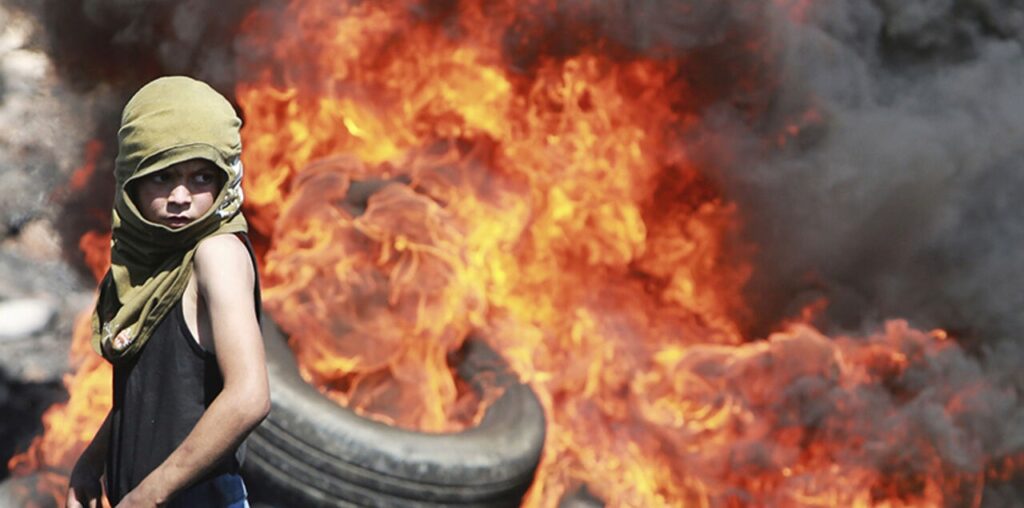 A Palestinian boy looks on near burning tyres during cashes with Israeli soldiers following a protest against the near-by Jewish settlement of Qadomem, in the West Bank village of Kofr Qadom near Nablus September 19, 2014. REUTERS/Abed Omar Qusini (WEST BANK – Tags: POLITICS CIVIL UNREST CONFLICT TPX IMAGES OF THE DAY) – RTR46XNM